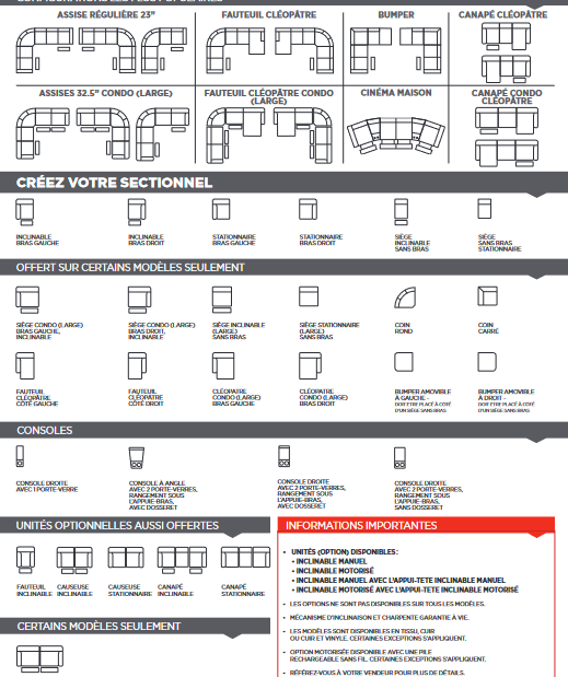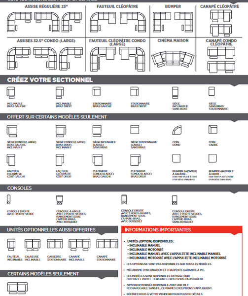 Les photos sont à titre indicatif seulement et ne montrent pas les couleurs disponibles. Elran offre un choix de 300 tissus et 200 cuirs.