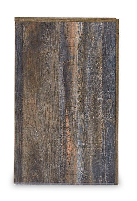 • Finition rustique marron avec des accents orange brûlé et bleu sarcelle dans un grain de bois reproduit avec une touche authentique.