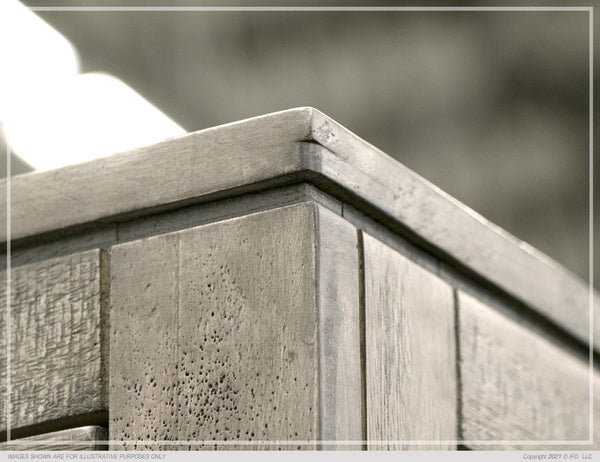 • La finition laquée en 13 étapes offre une protection et une douceur. Une finition brun clair translucide sur un bois vieilli à la main.