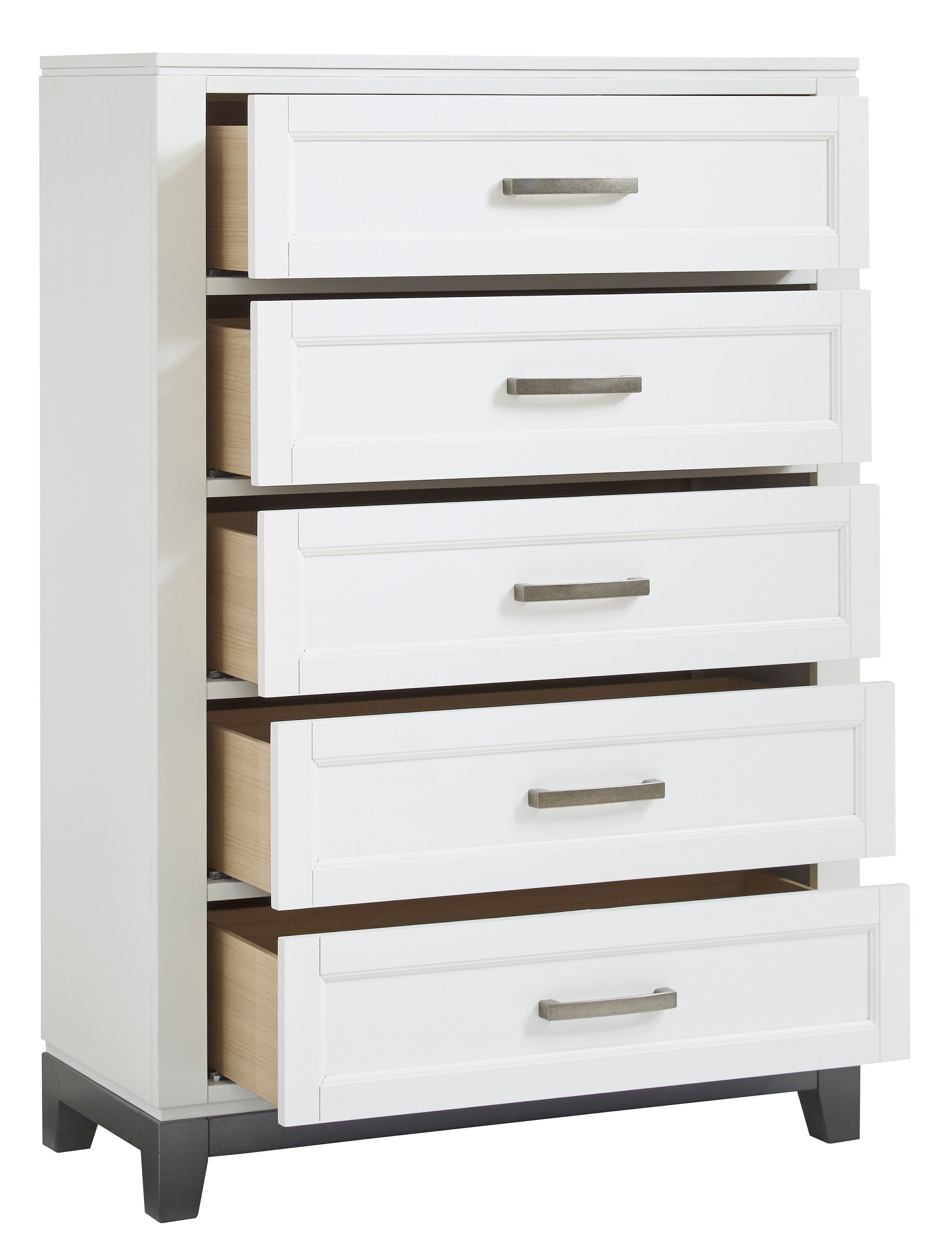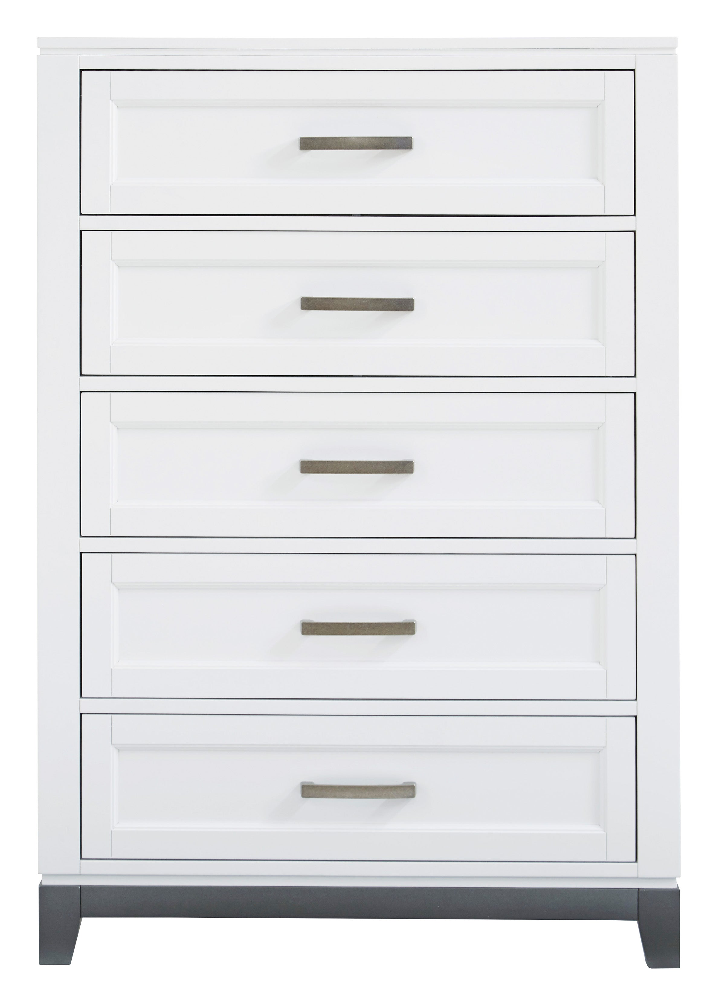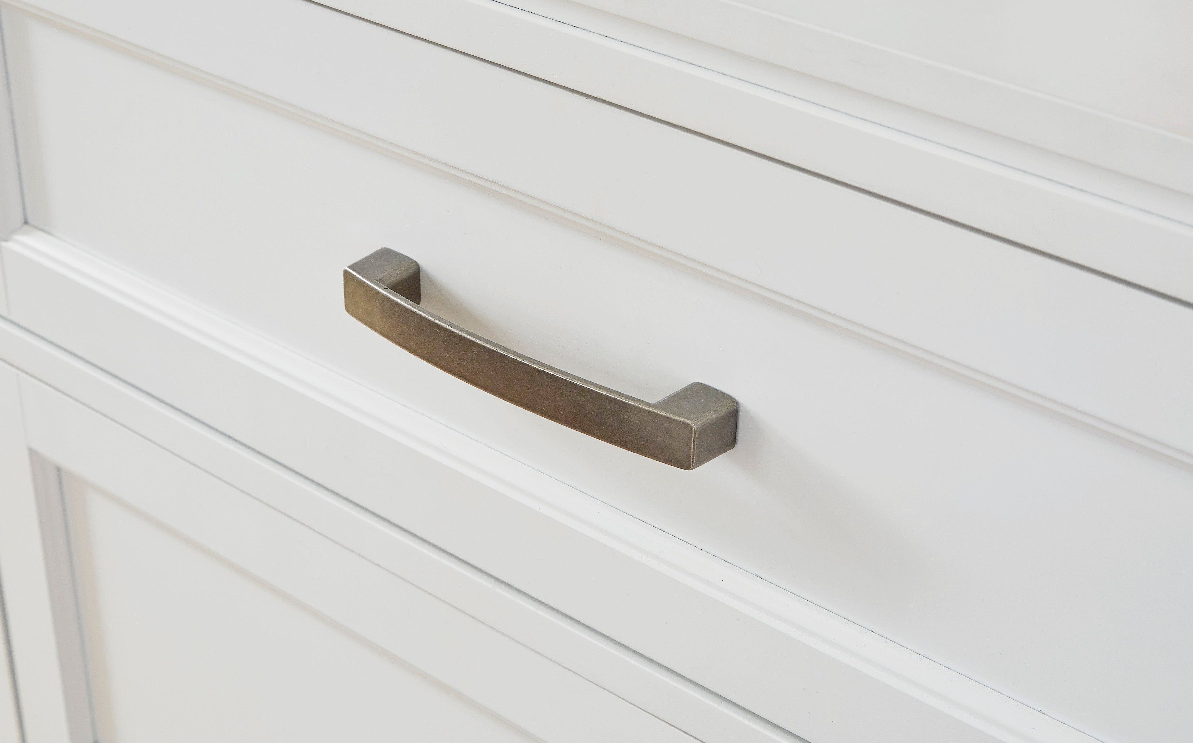 La finition blanc pure, les façades de tiroir de style shaker, les boutons en nickel satiné et une base de couleur acier contrastante complètent l'esthétique à merveille.