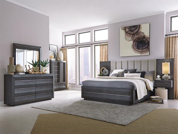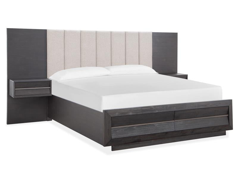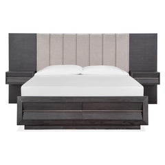 Lit avec tête de lit rembourrée et tables de nuit intégrées.