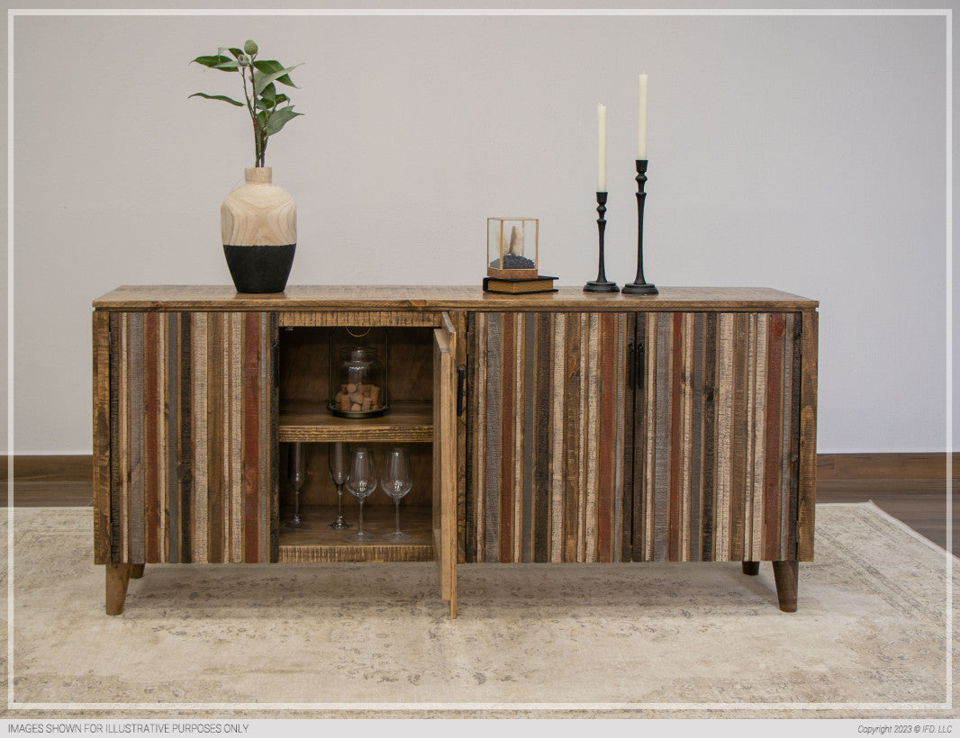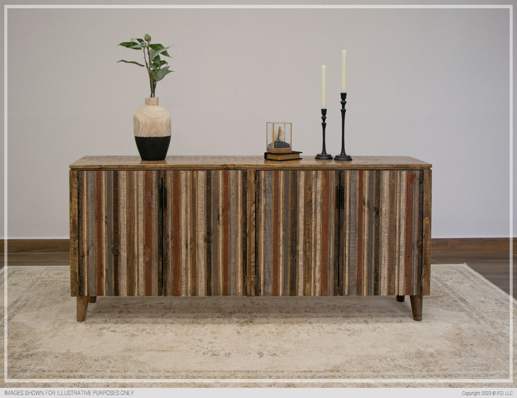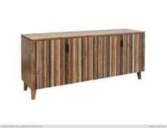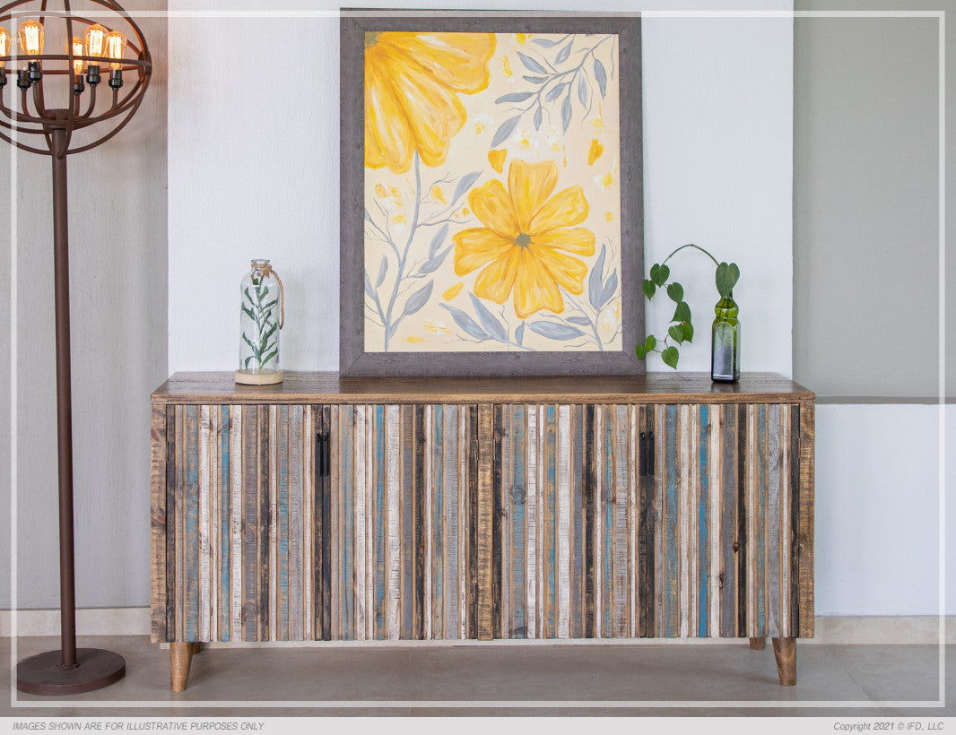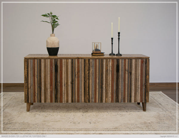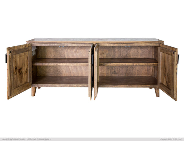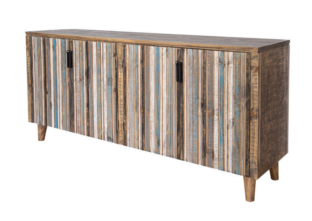La console Tiza est une pièce aux lignes épurées et intemporelle pour créer une silhouette simple. Fabriqué de bois de pin massif avec une douce finition multicolore à l'aspect vieillie appliqué la main. Les quatre portes s'ouvrent pour révéler de la place pour la vaisselle, les verres et les articles multimédias. La construction à tenon et mortaise assure la stabilité et la durabilité.