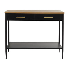 Table console en bois, de couleur noir mat et bois naturel. Comprend 2 tiroirs de rangement avec poignées d'apparence laiton.