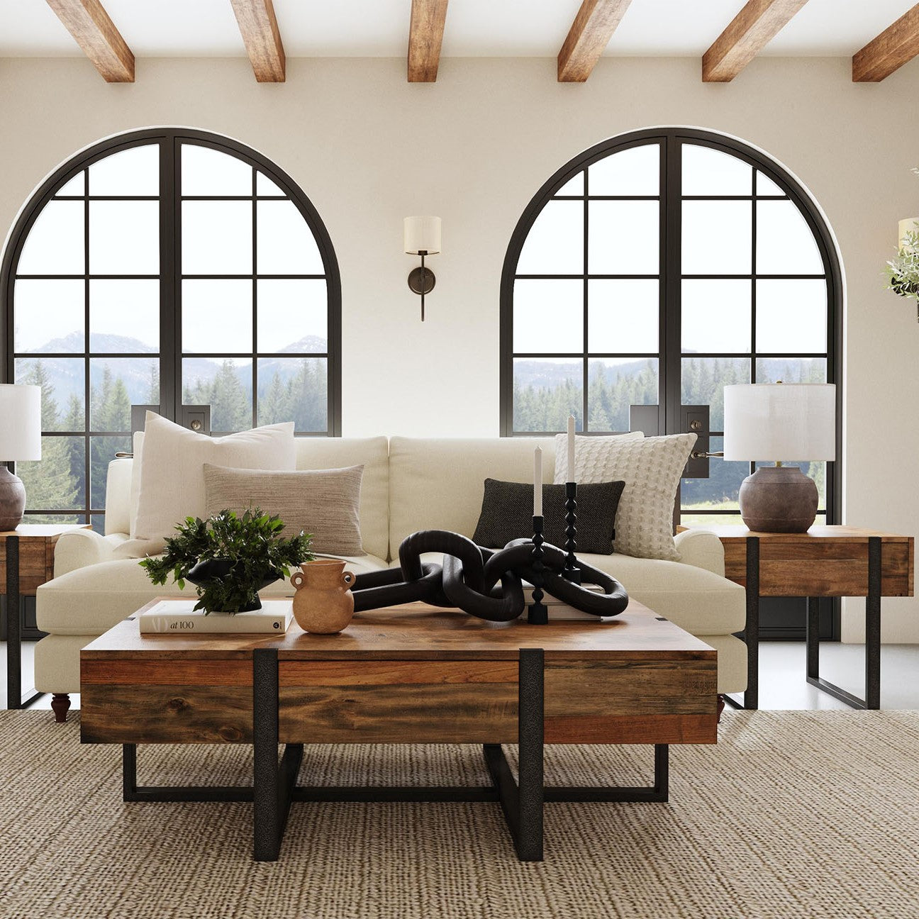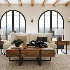 La conception industrielle et simple, met en valeur le bois, grâce à une finition miel rustique avec une base en fer vieilli. La collection Prescott marie l'informalité de la ferme rurale avec un loft urbain.