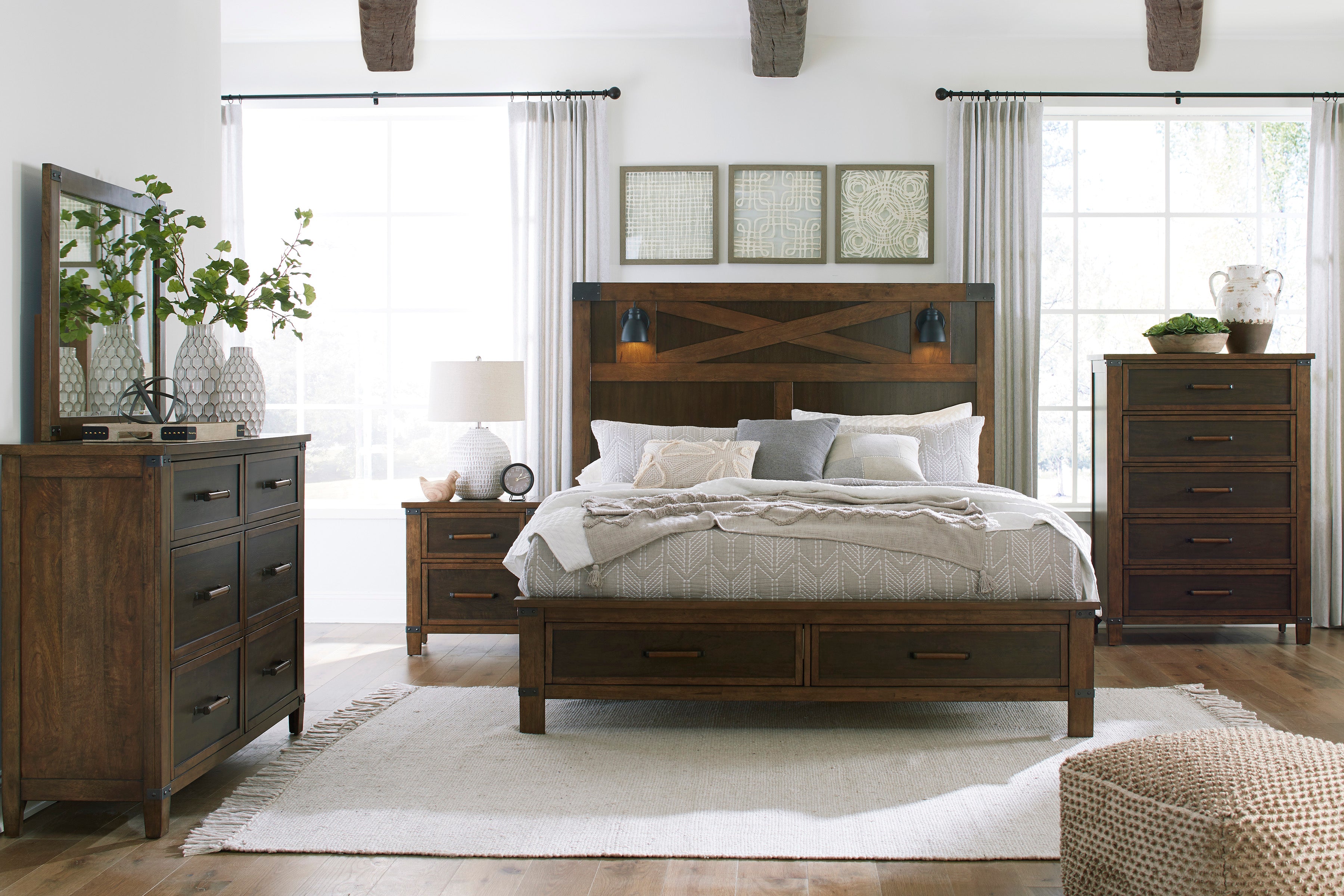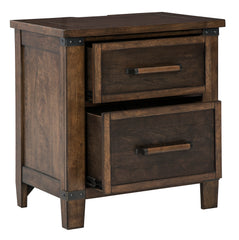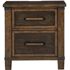 Les caisses bien proportionnées comportent des tiroirs entièrement finis avec une construction en queue d'aronde et des glissières latérales à roulement à billes. Poignées de barre en bois conçues sur mesure avec des passants en métal. La table de nuit comprend une alimentation 110 V avec deux ports de charge USB. Les tiroirs supérieurs ont des fonds en feutre noir.