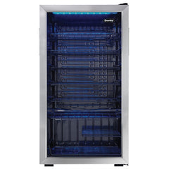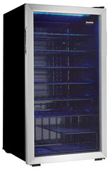 Lorsque vous avez plusieurs bouteilles de vin qui doivent être refroidies, la façon la plus pratique et la plus économique de les ranger, est de les placer dans un refroidisseur à vin autonome à la mode, comme ce modèle de Danby. Cette unité spacieuse offre 3,3 pieds cubes d'espace de refroidissement, conçu pour stocker jusqu'à 36 bouteilles de vos vins préférés sur des étagères métalliques noires attrayantes. Votre collection sera également très impressionnante grâce à l'éclairage intérieur à LED bleues qui met joliment en valeur les bouteilles à travers l'élégante porte en verre trempé. Les bouteilles seront toujours à la température que vous préférez puisque la gamme du refroidisseur de vin se situe entre 43°F et 57°F (6°C et 14°C). Aucune ampoule incandescente ne vient perturber le processus de réfrigération et la porte en verre est conçue pour protéger votre collection des rayons ultraviolets potentiellement dangereux. Cet appareil est doté d'une élégante poignée encastrée de style poche et d'une porte réversible qui vous permet de l'ouvrir du côté gauche ou du côté droit. Ce solide refroidisseur de vin est également assorti d'une garantie de 12 mois sur les pièces et la main-d'œuvre avec service à domicile.