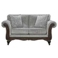 Le causeuse Emma traditionnel est recouvert d'un tissu en polyester de couleur gris ardoise entouré de garnitures en bois de cerisier et surmonté de pieds décoratifs. Le cadre du canapé comprend des accoudoirs roulés évasés, des sièges moelleux et des coussins décoratifs à franges, complète à merveille son style unique.
