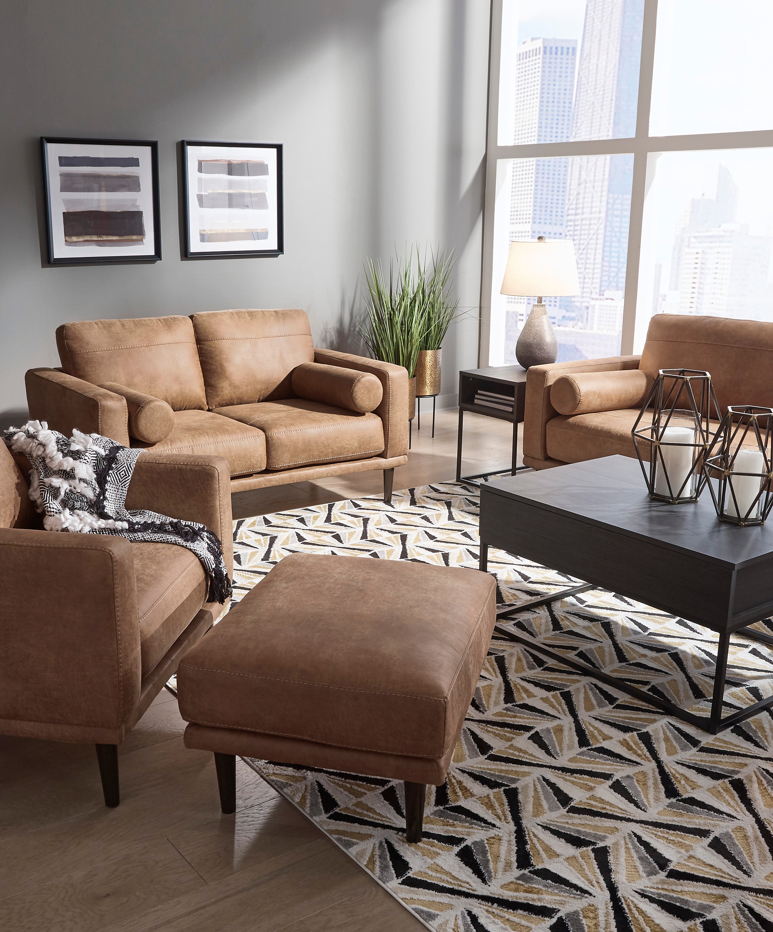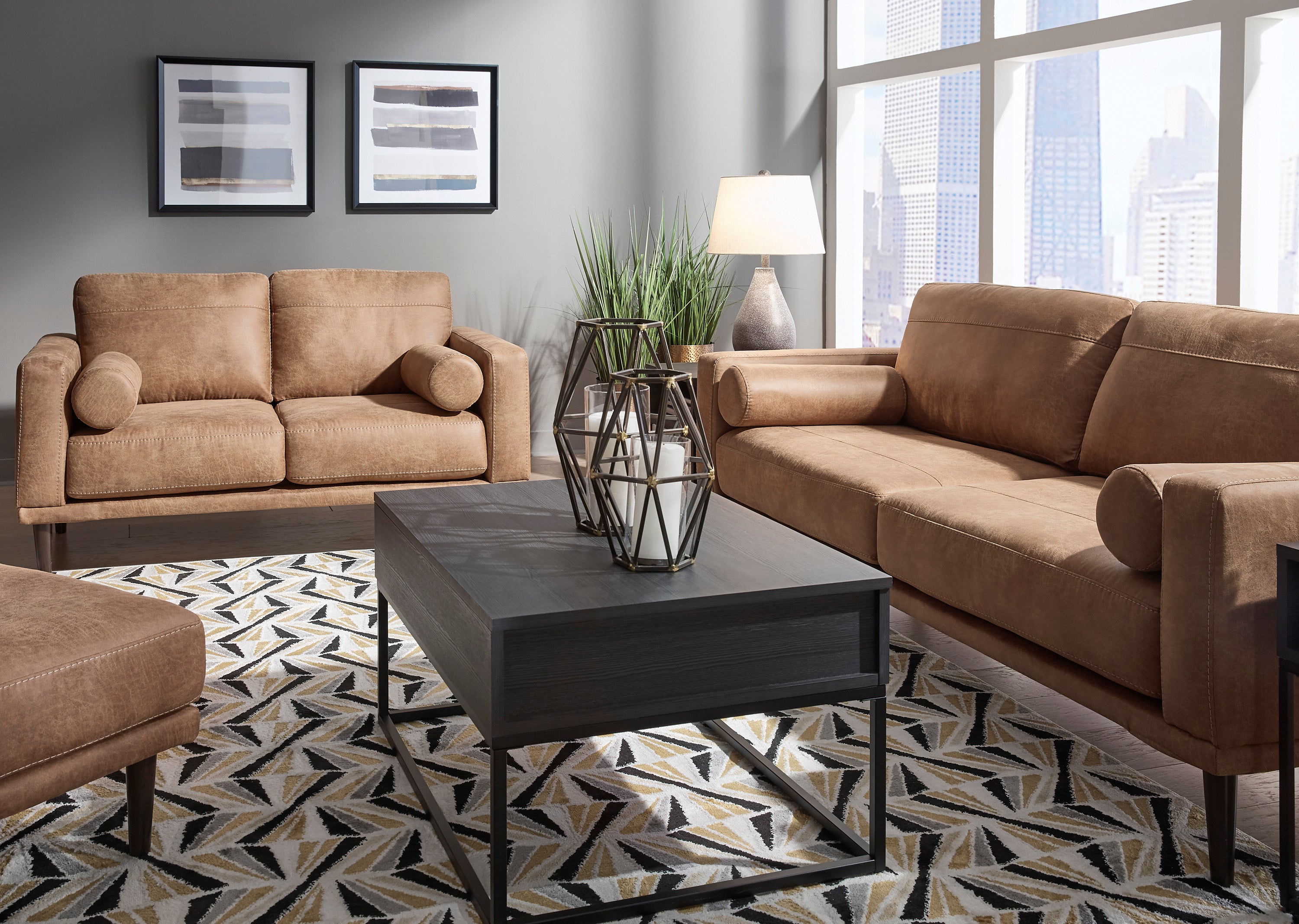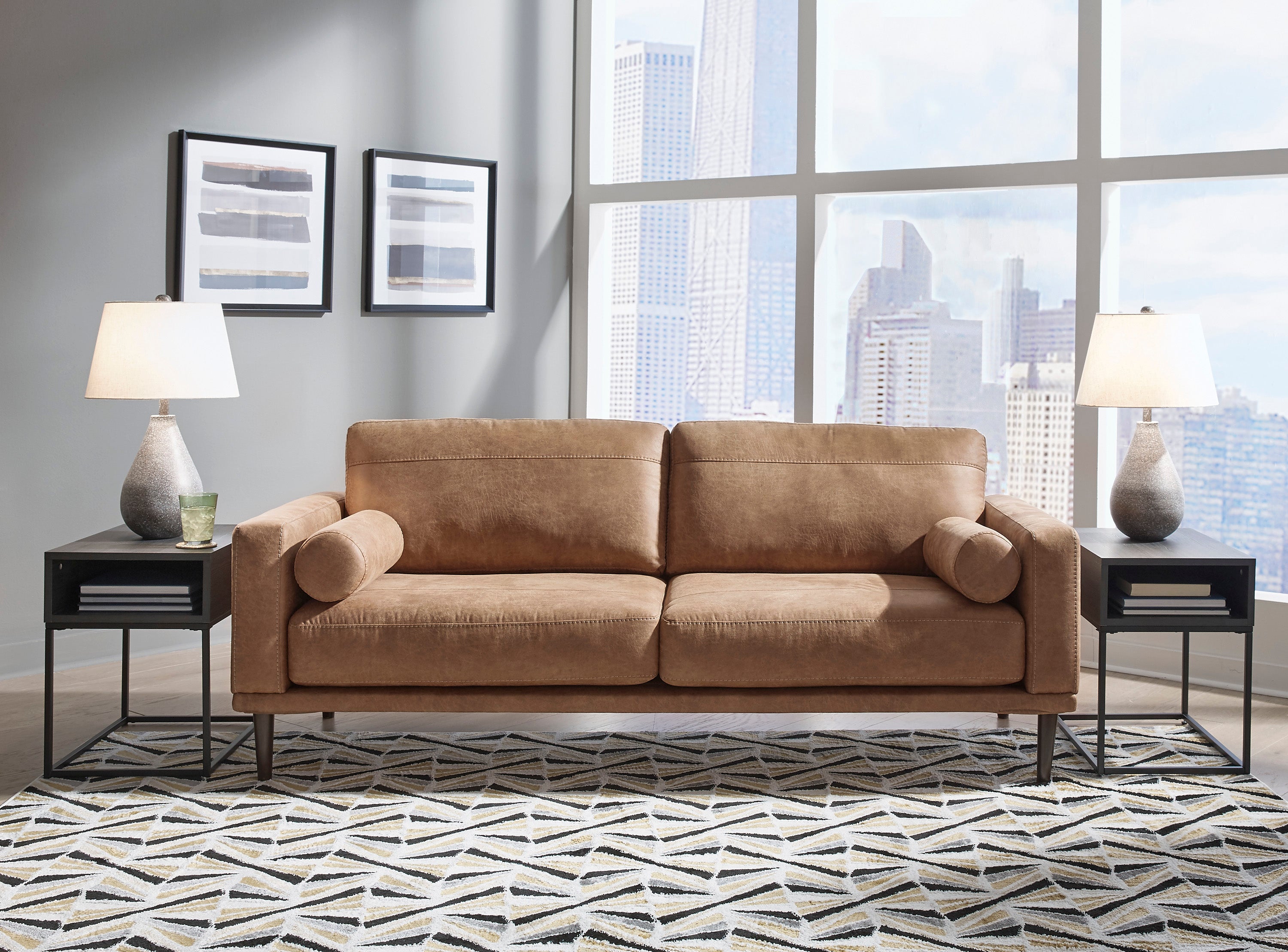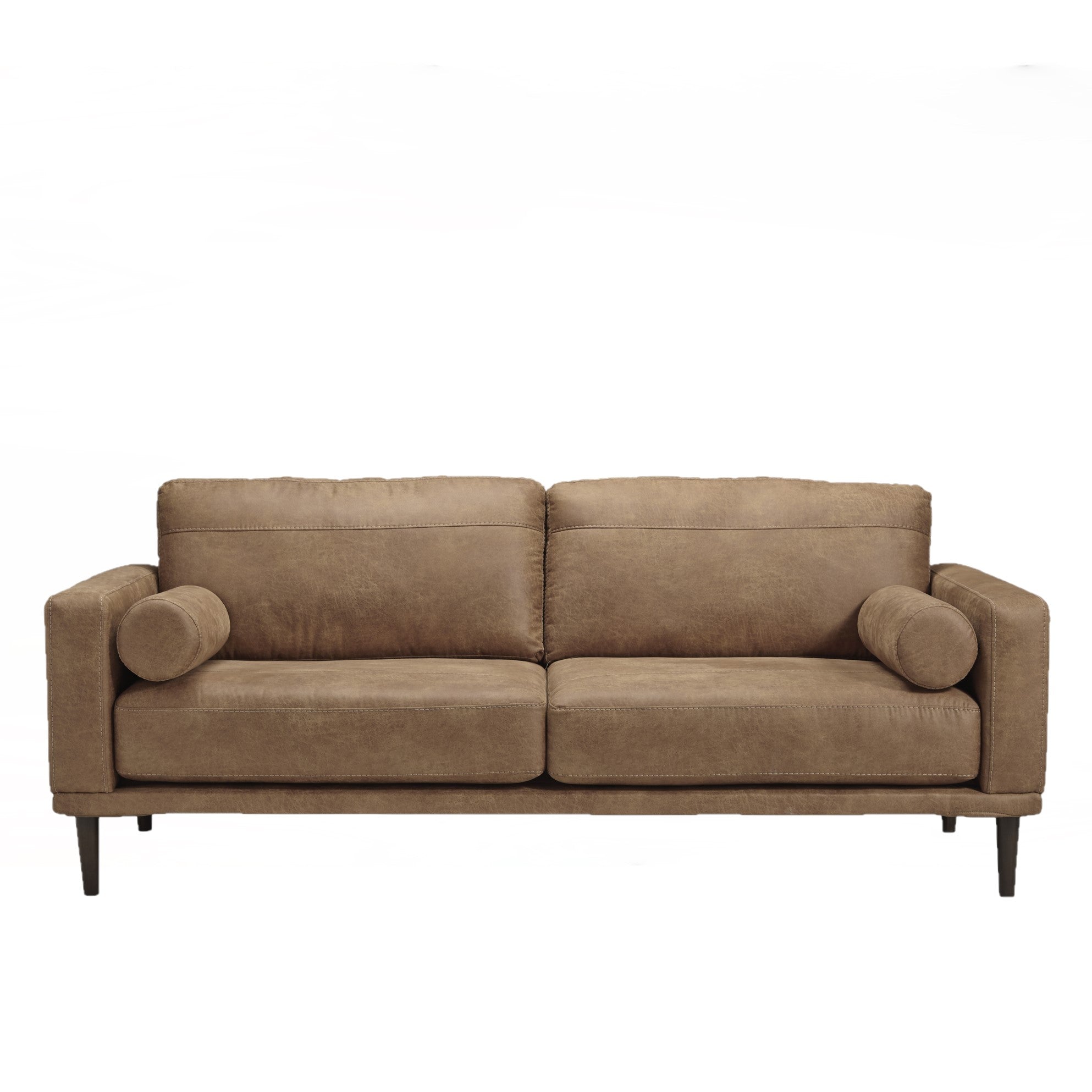 Pour une touche de fraîcheur dans votre espace, tournez-vous vers ce sofa design. Cette pièce vivifiante insuffle de la chaleur dans votre maison avec son revêtement en similicuir caramel saisissant, ses coussins traversins modernes et ses pieds fuselés. Détendez-vous à la fin d'une longue journée lorsque vous vous enfoncez dans ce canyon de confort.