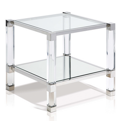 PTR: 080329 Table d'appoint en verre trempé, inox poli et acrylique munie d'étagères miroir. Dimensions: 24" x 24" x 22"